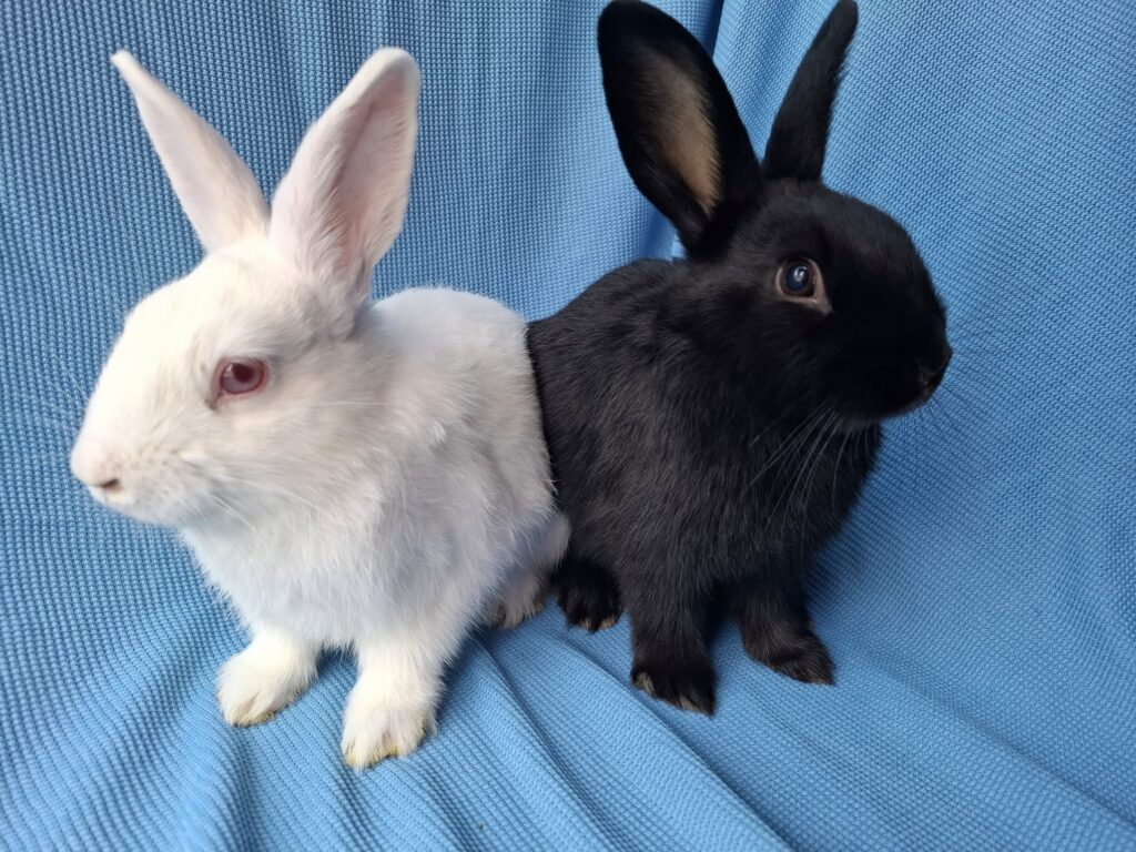 Midnight is a sleek, gentle black bunny with a curious nature, while Snowy is calm, cuddly, and pure white.