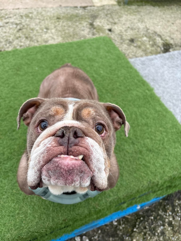 Meet Wilma, a lovely bulldog who is now ready to find her forever home after spending some time in our care. While with us, Wilma underwent investigations for issues relating to urination, and it has now been confirmed that she has bladder polyps. Wilma is doing well, and we are committed to supporting her ongoing care. We will cover any veterinary treatment relating to her bladder condition; however, any unrelated medical needs will need to be managed by her adopters through their own vet. She is currently on a special urinary diet, which we are happy to supply. Because of this, we are looking for adopters who live locally so they are able to collect her food from us and attend our vet should there be any recurrence or concerns. Wilma would be best suited to an adult-only, pet-free home where she can enjoy a calm and settled environment. She is a sweet girl who deserves a loving home that understands her needs and can give her the stability she deserves.