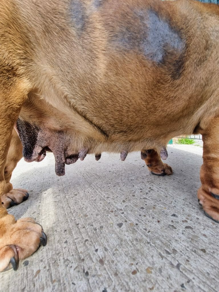Brandy was originally used as a breeding bitch before passed previous owner and it is very clear that she has had many, many litters. Because of this, her mammary tissues have become so enlarged that they are now inches from the floor. Not only is she incredibly uncomfortable as a result, but she’s at real risk of developing an infection. There is a very high chance that we will have to perform surgery in order to ease her suffering.