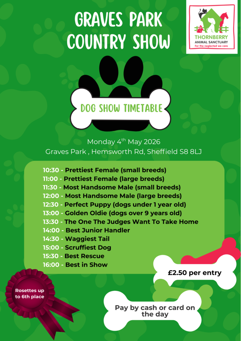 Join us at the Graves Park Show, where Thornberry Animal Sanctuary will be hosting the Dog Show! Bring your furry friends along and enter a range of fun, family-friendly classes — all while helping to raise vital funds for the animals in our care.